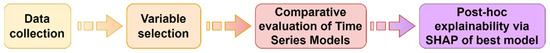 The proposed methodology was applied to the case study for the forecast of the LNG carrier charter rates, and it was implemented using the time series data presented in Section 2. Time series data from 1 January 2010 to 1 January 2017 were used. The aim was to predict the desired prediction variable, LNG 145K CBM spot rate, for the following dates: (i) 1 March 2017, (ii) 1 May 2017 and 1 July 2017. The methodology is composed of four main steps: (i) data collection; (ii) variable selection; (iii) comparative evaluation of popular time series forecast models; (iv) post hoc explainability analysis of the best performing model (Figure 3).