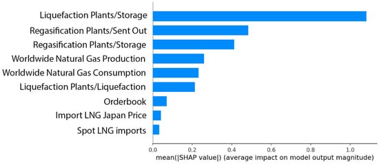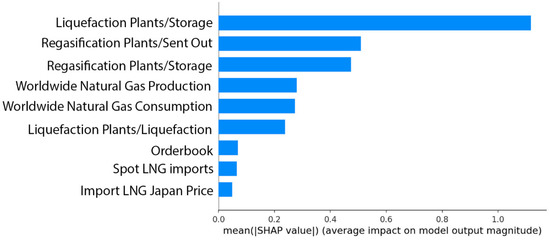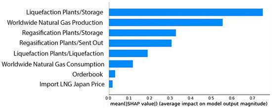 For the post hoc explainability analysis, the SHAP model was employed. Figure 4, Figure 5 and Figure 6 illustrate the summary plot with the eight variables with the highest contribution to the prediction output of the best performing model for the LNG 145K CBM spot rate for 2, 4 and 6 months, respectively. The analysis shows that almost the same variables proved to be most significant for the short and mid-term forecast of the prediction variable, a result that is in accordance with the initial variable selection and the correlation analysis.