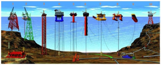 Examples of deep-water offshore production facilities. (1, 2) conventional fixed platforms (150–412 m); (3) compliant tower (457–914 m); (4, 5) tension-leg platform (TLP) (457–2134 m); (6) truss SPAR (610–3048 m); (7, 8) semisubmersibles platforms (semis) (457–1920 m); (9) floating production, storage, and offloading (FPSO) unit (1345–1500 m); (10) jacket platform (150–412 m); (11) subsea completion and tieback to a host facility; (12) subsea manifold [7]. Reproduced with permission from Chiemela et al., Journal of Marine Science and Engineering, published by MDPI, 2022.