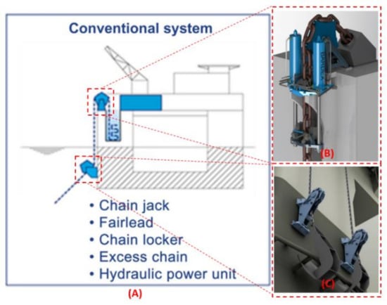 (A) Conventional chain jack tensioning system installed on a floating platform. (B) Schematic of a chain jack. (C) Schematic of fairleads [8]. Reproduced with permission from Ma et al., Mooring system engineering for offshore structures, published by Gulf Professional Publishing, 2019.