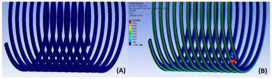 In the design of WECs, the mooring tensioner is connected to the mooring lines and the buoy. The wave energy drives the mooring tensioner to extend and rotate the shaft, which is connected to the PTO device to generate electricity. As shown in Figure 11, one end of the helical spring is fixed, and the other end is loaded. The spring wire in a helical torsion spring is loaded in bending and experiences a compression load on the inner surface and a tension load on the outer surface while it is subjected to cyclical external forces generated from the wave. The applied loads vary from minimum to maximum loading conditions, including a pre-tension load to keep the mooring line taut. Generally, the static mechanical properties, fatigue strength, and environmental durability of the composite in seawater conditions should satisfy the design requirements. The factors that are mentioned above are critical material selection criteria.