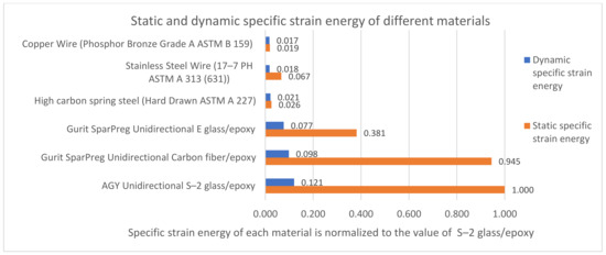 Figure 12 compares the static and dynamic specific strain energy of the spring materials that were discussed in Table 3. The static ultimate strength was used to calculate the static specific strain energy, which is represented by the orange bars in the chart. They show that a stainless-steel spring only has 6.7% of the static specific strain energy compared with S-2 glass/epoxy. The blue bars represent dynamic specific strain energy based on fatigue strengths at 106 cycles. They show that the S-2 glass/epoxy has the highest dynamic specific strain energy of all the materials.