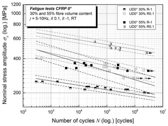 - Brunbauer, J.; Pinter, G. Effects of mean stress and fiber volume content on the fatigue-induced damage mechanisms in CFRP. Int. J. Fatigue 2015, 75, 28–38. [Google Scholar] [CrossRef]