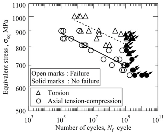 - Akiniwa, Y.; Stanzl-Tschegg, S.; Mayer, H.; Wakita, M.; Tanaka, K. Fatigue strength of spring steel under axial and torsional loading in the very high cycle regime. Int. J. Fatigue 2008, 30, 2057–2063. [Google Scholar] [CrossRef]
