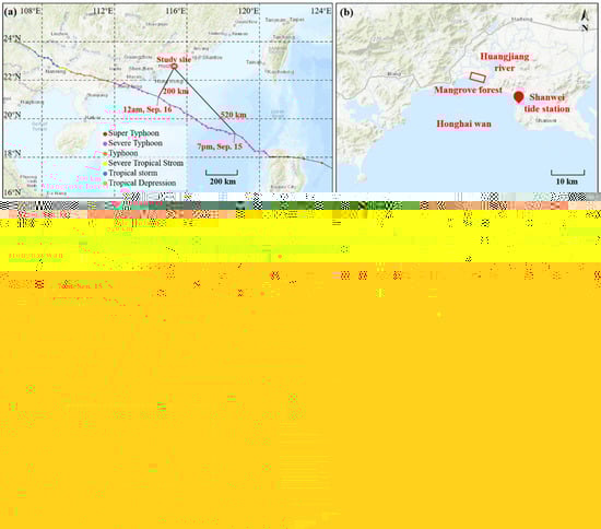 The study site (N22.83°, E115.21°) was located on the coast of Shanwei, Guangdong, China (Figure 1a). The planted mangrove forest is located along the coast of a lagoon in Honghai wan and is 13 km west of the Shanwei tide station (Figure 1b). In order to quantify the coastal protection provided by mangroves and understand the resilience of the planted mangrove trees against intense coastal storms, a field survey was conducted from 14 to 18 September 2018, during which the study site was heavily affected by super typhoon Mangkhut (Figure 1a). The track and intensity of typhoon Mangkhut were obtained from the National Meteorological Center of the China Meteorological Administration (CMA). The storm decayed to a severe typhoon after it left the Philippines and stayed as a severe typhoon until it made its second landfall at Jiangmen, Guangdong, China, at around 5 p.m. on 16 September 2018 (G.M.T + 8 time). The maximum wind speed at the typhoon central exceeded 45 m/s (level 14), and the lowest pressure in the center was 955 hPa upon landfall. During the typhoon event, the observed storm surge was 1.5 m, and the significant wave height was up to 9 m in the open sea in the Pear River Estuary, Guangdong, China [38], which is located 200 km southwest of the present study site. The study site entered the level 7 wind circle (520 km from the typhoon center) at 7 p.m., September 15, and was directly affected by the typhoon winds for the next 24 h. The shortest distance from the study site to the track of typhoon Mangkut was 200 km, within a level 10 wind circle. During the influence of typhoon Mangkhut, the observed wind level reached 8 to 15 in Shanwei city. Strong gusts of wind caused vast cases of traffic accidents, fallen trees, and damaged advertisement boards.