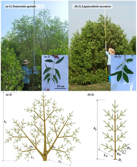 Photo of one individual tree (a-1), photo of the leaves (a-2), and illustration of one tree (a-3) for Sonneratia apetala. Photo of one individual tree (b-1), photo of the leaves (b-2), and illustration of one stem (b-3) for Laguncularia racemosa. The plant height is hp, the length and diameter are denoted with L and D, with the subscript s, B, and T indicating parameters for the stem, branch, and twig, respectively.