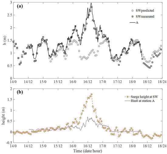 (a) Water depth, h, at station A (black curve) and the predicted tidal level (circles) and measured water depth (squares) at Shanwei tide gauge station (SW, data obtained at http://global-tide.nmdis.org.cn/, accessed on 15 December 2021). Note that a 0.44 m difference was added to h at station A considering the difference in the zero-elevation reference. (b) The storm surge height (i.e., the difference between the measured water depth and predicted tidal level) at SW and the significant wave height at station A.