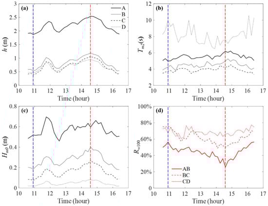 The water depth h (a), mean wave period Tm2 (b), and significant wave height Hm0 (c) measured at stations A to D from 10:30 to 16:30, 16 September. (d) shows the wave attenuation rate over 100 m Rw100 (Equation (5)). The vertical red and blue lines indicate the time of the maximum and minimum water depth at station A over this time period.
