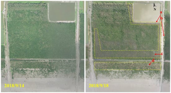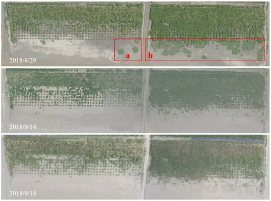 Aerial photos indicate accretion in the front region of the mangrove (correspond to the dashed yellow-line bounded area in Figure 1c) on 29 June (top), 14 September (middle), and 18 September (bottom). Two examples in the red boxes a and b showed that severe sedimentation buried the salt grasses grow along with the mangrove seedlings, with the clearer comparison shown in Figure 9 and Figure 10, respectively.