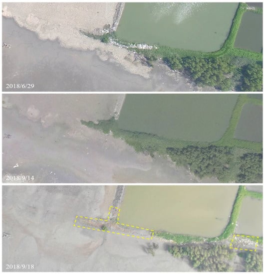 Aerial photos compare the fishpond embankment at the western edge of the mangrove forest (i.e., the yellow-line bounded area in Figure 1c) on 29 June (top photo), before (14 September, middle photo) and after (18 September, bottom photo) the typhoon influence. Obvious embankment breakage was shown by the dashed yellow-line bounded areas.