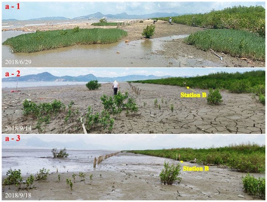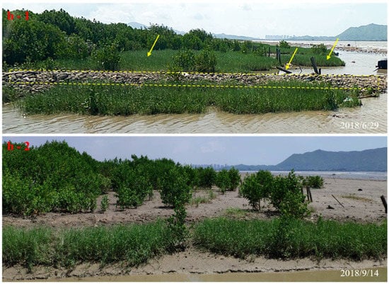 One of the interesting findings of the survey is that the front region of the mangrove (both the sparse Laguncularia racemosa region and the mudflat) experienced fast sedimentation during the time period from 29 June to 14 September (Figure 8). Two of the most obvious pieces of evidence are shown in the red boxes a and b in Figure 8, within which the Laguncularia racemosa seedlings and salt grasses were grown together on 29 June. However, the pre-typhoon survey on 14 September showed no salt grasses but only mangrove seedlings because the salt grasses were buried by sedimentation. A closer comparison of regions a and b is shown in Figure 9 and Figure 10, respectively. Specifically, during the first survey (29 June to 1 July), the salt grasses were about 20 to 30 cm in height, which was comparable to the height of some of the small seedlings (Figure 9a-1 and Figure 10b-1). At the beginning of the second survey (September 14), only the mangrove seedlings were standing in regions a (Figure 9a-2) and b (Figure 10b-2). A rough test showed that the 20 cm surface soil was soft but quite hard further down in region a (Figure 8), suggesting that the 20 cm deep surface soil was newly deposited sediments. The burial of the salt grasses but not the mangrove seedlings can be explained by the greater plant flexibility in the salt grasses, as flexible plants bend under tidal currents and waves [65,66,67], which add to their vulnerability to sediment deposition. In this case, the sedimentation benefited the mangroves in competition with salt grasses. However, when the sedimentation rate exceeds the rate of mangrove seedling growth, they can be buried as well. Recent experiment examined seedlings’ accretion and erosion thresholds which showed that seedlings are likely to survival sediment accretion (10 out of 12 specimens) while, for some species, the seedlings can be negatively affected by sediment erosion [68].