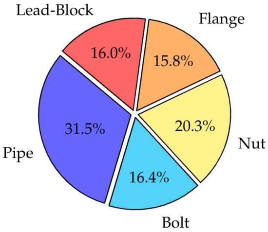 Newcastle University’s towing tank was used for the data collection needed for the image classification and object identification tasks. In particular, a dataset consisting of five different classes of objects was compiled, including bolts, hex nuts, flanges, pipes, and lead blocks (representing anodes). These objects were chosen because they are common in underwater structures and were readily available during the image data acquisition step. The above objects were initially placed inside the towing tank. Then, videos were captured using an underwater camera. During the acquisition process, different lighting conditions were used to record the underwater objects, including high and low illumination levels (which simulated the underwater environment as much as possible). In addition, to broaden the variety of the dataset, the above objects were used outside the towing tank for image collection. Subsequently, images were extracted from the video files, which resulted in the creation of around 2670 photographs in total.