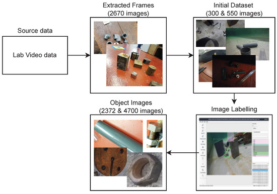 In addition to the original laboratory dataset, a supplementary 300-image dataset was prepared to serve as the foundation for image classification algorithms. The items in these 300 photographs were manually labelled, and these labelled objects were subsequently removed to generate a dataset including images of five-class object classes. The image classification challenge required only particular items and not the complete scene to be present in the photographs. In order to achieve this, a script was created to crop the photographs in the dataset. As inputs, the custom software received the image to be cropped and the file containing the data of the item labels, and it cropped the objects on the provided image. Finally, the script was applied on the prior dataset, resulting in the generation of 2372 object pictures.