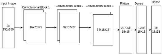 The most essential parameters in the CNN model are listed in Table 2. The first step is to crop the input image dimensions to 150 pixels on the horizontal (width, w) and vertical (height, h) planes, and it contains three colour channels (RGB colour depth). The next step is feature extraction, which happens as the image is processed through the convolutional layers (Conv layer). After the first Conv layer, the channels are increased to 16. After the second Conv layer, they are increased to 32, and after the third Conv layer, they are increased to 64. Additionally, the Max Pooling technique [43] is used after each convolution. This leads to a decrease in the size of the original input, which decreases from pixels to pixels. Next, the output of the Max Pooling layer has to be flattened so that it can appropriately link to the Dense layers, and then lastly, to the classification layer, where the prediction will be made. The details of the image classification CNN model are shown in Figure 5.