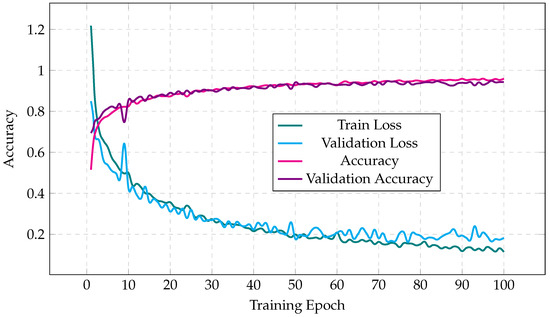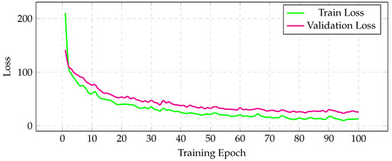 The model was altered to function based on the five classes; also, parameters such as the batch number for the GPU that was utilised and the picture input size were updated to conform to the model’s needs. Figure 9 shows the model’s outcomes in terms of training and validation Loss. As can be seen from the plot, both losses follow the same decreasing trend, and the model converges with just a minor difference between them. In a perfect world, the training Loss and validation Loss should be equal; if they are not, this is an indicator of some overfitting. The gap between them remains the same after approximately epoch 50, and there is no indication that the validation loss will deviate further compared to the training Loss. Nevertheless, it is impossible to achieve ideal results, and some overfitting is always acceptable.