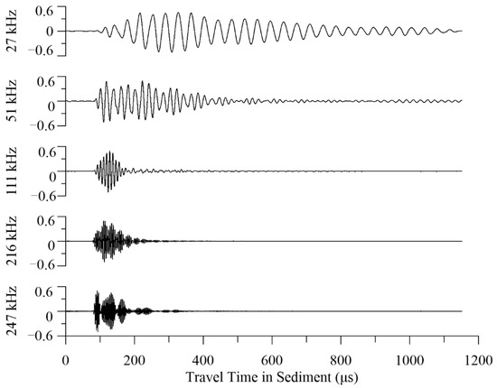 Before starting the measurement, all equipment was connected as shown in Figure 1 and place the sediment cores on the acoustic measuring platform. The sediment core length was measured with accuracy of ±0.1 mm by the measuring platform, and the sound wave sampling rate was 16 MHz by the acoustic instrument, so that the accuracy of the sound speed was estimated to be better than ± 0.1% for a typical sample with a length of 30 cm and the sound speed of 1500 m/s. The sound speed and attenuation were measured at the frequencies of 27, 51, 111, 214, and 247 kHz, respectively. The waveforms of sound signals at different frequencies recorded by the acoustic system are shown in Figure 2. The measurement was conducted in the standard condition (standard atmospheric pressure, 23°), and under the standard laboratory conditions the laboratory measurements can be correction to the in situ condition by using sound speed ratio method [17]. The details of the acoustic measurements can be found in Hou et al. [18] Section 2 and Figure 2.