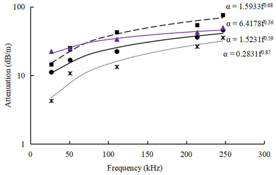 The attenuation dispersion of different sediments at the frequency of 27–247 kHz: α = 1.5933f0.68(silty sand); α = 1.5231f0.59(silt); α = 6.4178f0.35(clayey silt); α = 0.2831f0.87 (silty clay).