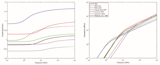 In Figure 6, the attenuations of coarse sand and silty sand are the greatest attenuations in the low-frequency band (<10 kHz). However, as the frequency increased, the attenuation of coarse sand and silty sand sediment become lowest in the high-frequency band (>10 kHz). By contrast, the silty clay and clayey silt sediments have low attenuation in the low-frequency band (<10 kHz) and become high as the frequency increases. In the low-frequency band, the sound speed ratio of silt and clayey silt is similar, while in the high-frequency band, the sound speed ratio of silt and is obviously higher than that of clayey silt, which is because at the high frequency, silt and clayey silt have almost equal sound attenuation, while the sound speed of silt is higher than that of clayey silt.