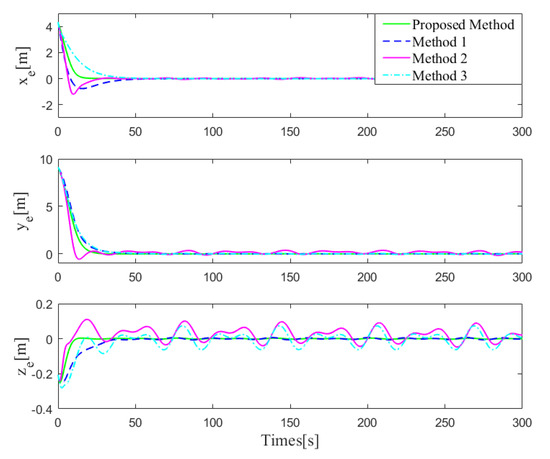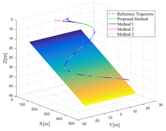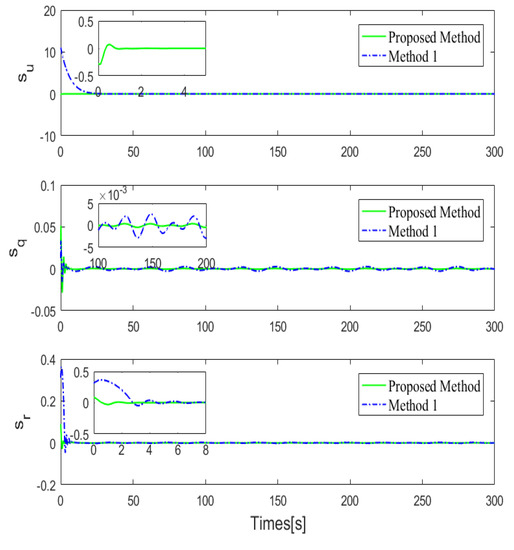 The initial position and posture vectors of Case 2 are selected as and the initial velocity vectors are given by . The comparisons of 3D trajectory tracking performances are shown in Figure 9 and the 2D profiles are shown in Figure 10. From the 3D figure, it seems that all three methods can achieve good trajectory tracking; however from the 2D profiles, it can be seen that the tracking performances of the three methods are different. To better analyze the tracking performances, the transitions of tracking errors are illustrated in Figure 11, which clearly shows that the proposed controller performs best with almost no overshoot and chattering, while the other two controllers show overshoot and steady-state chattering, more or less. To conduct more quantitative analysis with simulation data, the tracking error data analysis in the steady-state stage is carried out for the four methods. Similar to Case 1, mean absolute error () and variance () are calculated, with detailed data analysis results shown in Table 8. From the perspective of tracking error, the proposed method and Method 1 perform better, while Method 2 and Method 3 perform slightly worse. By comparing the variance of tracking errors, it can be easily found that the tracking stability of the proposed method is the best. Therefore, based on the above analysis, it can be concluded that the proposed method performs best in tracking accuracy and stability. Next, the advantages of the proposed controller are verified one by one through comparative simulations. Compared with the general sliding mode controller, the biggest advantage of the controller proposed in this paper is the improvement of the sliding mode surface and the finite-time convergence. In order to demonstrate this advantage, the sliding mode surfaces of proposed controller and Method 1 are specially shown in Figure 12. It is easily seen that the controller proposed in this paper can achieve the fast convergence of the sliding mode surface almost instantaneously and in the steady-state stage, the sliding mode surface basically has no chattering, while the conventional sliding mode controller has a longer convergence time and poor steady-state performance. Therefore, it can be proven that the finite-time convergence method proposed in this paper has obvious advantages.