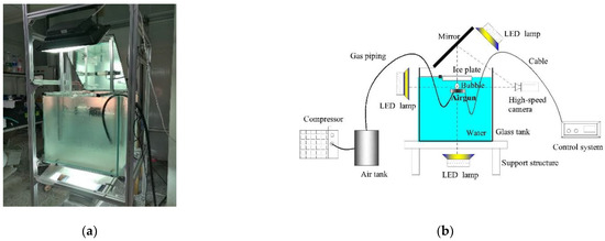 The structural system included a water tank and support framework, as shown in Figure 2a. The square water tank was made of glass of 12 mm and the principal dimensions were 600 × 600 × 600 mm3. The distances between the bubble surface and the tank walls were large enough compared with the bubble diameter, so the boundary effect of the tank wall can be ignored. The water depth was 580 mm and the distance of the exhaust port of the airgun below the free surface could be adjusted according to working conditions. An air-free ice plate was prepared by degassed water and located on the free surface of the water. Then, the experiment could start and the dynamic change of ice-water-gas interaction was recorded and analyzed. The ice sample used in this paper was a circular ice plate with a diameter of 380 mm, and the thickness depended on the requirements of the test. The detailed preparation process, as well as the mechanical properties of the ice plate, can refer to Yuan et al. [10] and Ni et al. [29]. The bending strength was 2.39 MPa by the three-point bending test. The Young’s modulus was 6.25 GPa and compressive strength was 9.41 MPa by the uniaxial compression test. Other physical properties are suggested to refer to those of freshwater at the same temperature (−5 °C) for reference. For example, Poisson’s ratio can be taken as 0.33 from recommendation of Hobbs [33]. The water temperature during the test was about 10 °C and the pressure of the surrounding liquid was hydrostatic pressure, which was about 1.96 kPa for the exhaust port with a submergence depth of 0.2 m.
