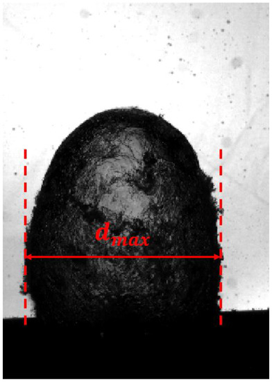 As the high-pressure gas was released from the unilateral exhaust port of the airgun, the gas velocity was not uniform around but had a strong directivity. As a result, unlike the spark or explosion bubble with a spherical shape in the expansion stage, the airgun bubble was not spherical but in a ‘pear-like’ shape in the expansion stage, as shown in Figure 3. The largest horizontal diameter (corresponding to the largest volume) of this pear-shaped bubble in a free field is an important physical quantity. was measured by using a postprocessing software of Photron camera, which can measure the distance between two points referring to a scale plate. The picture corresponding to the largest volume of the bubble was selected, before the software was adopted to measure the horizontal distance between two outermost points (left and right) on the bubble surface, as shown in Figure 3. Each was measured at least three times. The average value was chosen as and the uncertainty was found no more than 2.6% for all the cases. was determined by the working pressure directly. As long as one knows the variation law of and , the ice-breaking capability of the airgun bubble can be quantized by using instead of .