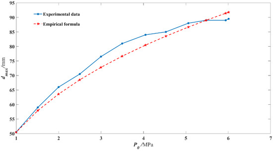 A series of experiments of the airgun bubble in a free field under different were done and the results were presented in Figure 4. To determine the coefficient C, we fitted the curve in Figure 4 and found C approximate to here. Therefore, it is easy to understand that rises along with and the rise of dmax gets slow when P0 gets large.