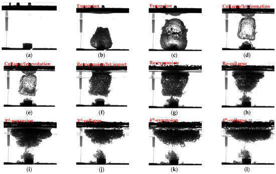 As per Figure 8a–c, the airgun released high-pressure got into water and formed a ‘pear-shaped’ bubble. The bubble expanded before reaching a maximum volume firstly in Figure 8c. The top of the bubble did not contact the ice plate and the ice plate was kept intact. Because the pressure of the bubble was lower than the ambient water pressure when the bubble reached maximum under inertia, the bubble would shrink under the ice surface, as shown in Figure 8c–f. Meanwhile, the bubble approached the ice surface under the action of buoyancy and attraction of the ice plate. As a result, under the action of pressure difference, the lower surface of the bubble moved faster towards the ice than the upper surface of the bubble and involuted into the bubble. The jet was generated as a result, as marked in Figure 8e. When the high-pressure bubble collapsed to the minimum volume, the ice plate was damaged and radial cracks appeared, which could be seen in Figure 8f. Then the bubble re-expanded, as shown in Figure 8g. The bubble still moved towards the ice surface and touched the lower surface of the ice plate. Under the action of expansion of the bubble, the outward motion of the fluid expanded the cracks of the ice plate a little. After several re-expansions and re-collapses, the bubble rose to the lower surface of the ice and the jet impacted the ice directly, as shown in Figure 8h, followed by a retarded flow. One could see that the free surface rose and the ice plate started to break up under the impact of the bubble and retarded flow. Finally, the bubble burst at the free surface and a distinct free-surface ‘spike’ was formed as marked in Figure 8i. This free-surface ‘spike’ or water ‘hump’ was formed under the combined effects of gas releasing, a coalesce of bubbles and free surfaces, buoyancy, and inertial forces, etc. It pushed the ice fragments turning up and expanded the crevasse of the ice plate. Finally, the gas was released into the air and the bubble dissipated as shown in Figure 8j.