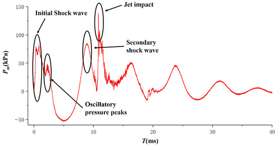 In the ice breaking experiment by using an airgun bubble, the ice plate could be regarded as a complete wall before it was broken. Therefore, it was helpful to study and analyze the pressure characteristics induced by a high-pressure airgun bubble near a rigid wall, which will provide a foundation of load characteristics for icebreaking. In this section, the rigid wall was simulated by an aluminum circular plate with a diameter of 380 mm and a thickness of 10 mm. A wall pressure sensor was placed at the center of the aluminum plate perforated. The model of the pressure sensor was PCB 113b21. The working pressure of the airgun P0 was 1.52 MPa and the explosion distance h was 52 mm. The shooting frequency was 20,000 frames/s, and the typical photos of the case were shown in Figure 6 at different moments. The time-history curve of measured pressure Pm in the center of the plate was presented in Figure 7, in which Pm was relative pressure with an initial value of 0 kPa.