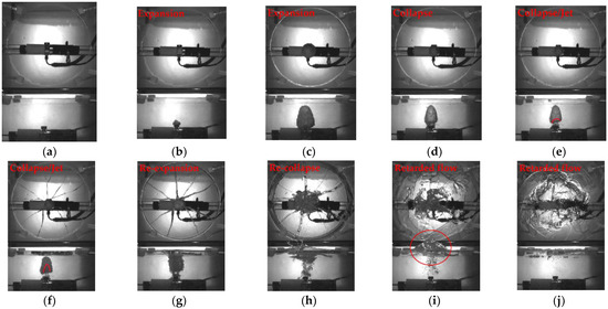 In this section, a case was chosen to study the full development of ice-water-gas interaction during the ice-breaking process. The parameters adopted in this section were as follows: the thickness of the circular ice plate was 17 mm, the initial pressure of the high-pressure airgun was 1.7 MPa, the air storage chamber’s volume was 50 mL, the explosion distance was 65.5 mm, and the maximum horizontal diameter of the air gun bubble was measured as 64.2 mm. Under this working condition, the distance parameter was 1.02 and the ice thickness parameter was 0.28. Figure 8 provided the development of the bubble and the ice plate, in which each picture included both the top and side view. The upper part of the picture was a top view, which was mainly used to observe the crack propagation and failure patterns of the ice plate under the high-pressure airgun bubble, whereas the lower part was a side view, which was mainly used to observe the motions of the bubble and free surface. Each picture had a corresponding moment below it.