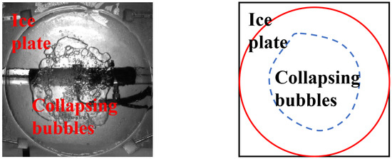 When the distance parameter was very large, and/or the ice thickness parameter was very large, the ice may not be broken, as shown in Figure 12. In this case, there would be no crack and obvious change on the ice plate, or the ice plate was kept intact. Meanwhile, bubbles were trapped and attached to the lower surface of the ice plate after collapsing, as shown in Figure 12. In this pattern, there was no fracture energy of the ice plate and the whole kinetic energy of the ice plate was negligible as well.