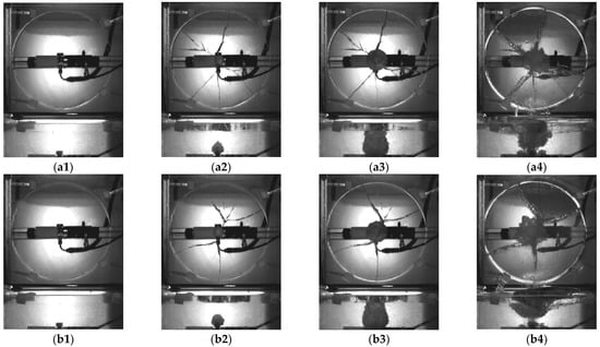 The damage patterns of ice under airgun bubble loads with the same condition H = 0.75, T = 0.30 (P0 = 2.44 MPa, h = 70 mm, tice = 20 mm). (a1) t = 0.00 ms, (a2) t = 0.90 ms, (a3) t = 4.50 ms, (a4) t = 25.00 ms, (b1) t = 0.00 ms, (b2) t = 0.90 ms, (b3) t = 4.50 ms, (b4) t = 25.00 ms.