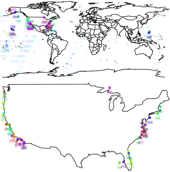 Top panel: World map with the coordinates of the 59 buoys whose measurements constitute the datasets analyzed in this paper. Bottom panel: Zoom of the top panel that shows the US mainland with the coordinates of the buoys close to it. The identification number is that in Table 1.