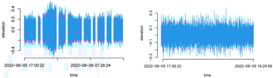 In the left panel of Figure 2, it is displayed part of the recorded data for buoy 433. The displayed data results from restricting the 1,622,186 observations stored for buoy 433 and taking the ones corresponding to the first time points. As it is obvious from the plot, the first time points contain unobserved elements. Indeed, 410,144 observations have been made out of the 5 × selected for the study (see Table A2, in Appendix A). From the left panel of the figure, it is also observable that the unobserved data splits the time series in ten parts. The right panel of Figure 2 is a zoom of the left panel containing solely the part to the left of the time series.