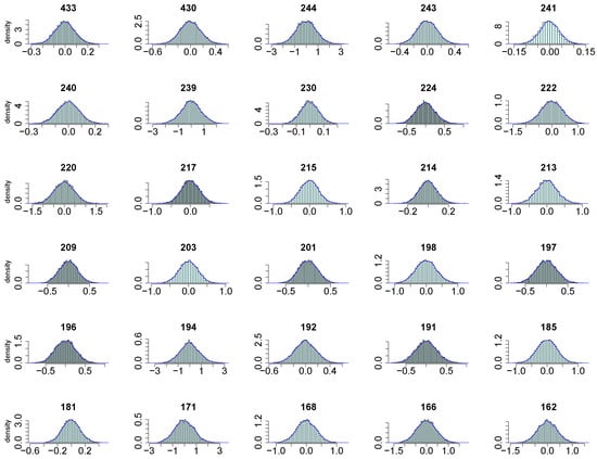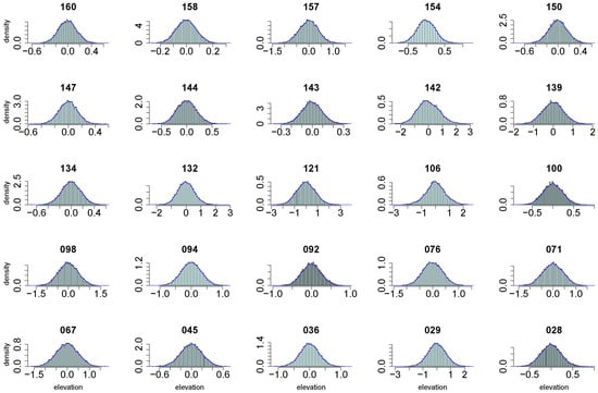 First, despite the time series associated to each buoy consists of non iid (independent identically distributed) drawn observations, in Figure 3 it is plotted the histogram and kernel density estimated curve associated to each of the 55 time series for a time period of 2.13 h in general and of 1.05 h for the buoys in For each histogram 70 cells have been used; but for buoy 241 that is plotted based on 40 cells. A Gaussian kernel is used for the density estimations with the bandwidth resulting of applying least squares cross validation [,]. The obtained bandwidths are reported in Table A3, in Appendix A. These plots are done to display descriptive information on the datasets. Note that the null hypothesis of Gaussianity in (5) cannot be rejected by just inspecting the plots. This is due to the fact that when testing the null hypothesis of Gaussianity it is assumed X is a Gaussian process and the objective is to reject such assumption by the evidence provided by the data. This is done at certain significance level. Here, it is used 0.05. By inspection of the plots in Figure 3, one cannot guarantee whether there is enough evidence for such a rejection as it cannot be quantified.