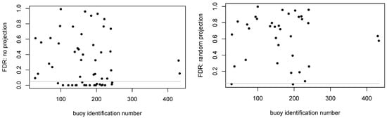 In order to study the Gaussianity of the datasets under study, it is first analyzed the one-dimensional marginal distribution of the process. This is because a rejection of the null hypothesis (4) implies the sought rejection of the whole distribution of the process, in (5). For analyzing the one-dimensional marginal distribution, it is made use of the Epps and Lobato and Velasco tests commented in Section 3. The results are displayed in Table 4 for the particular case of a time period of 2.13 h in general and of 1.05 h for the buoys in B. There, for each dataset, associated to a buoy (columns 1 and 5), it can be observed the p-values resulting from applying the Epps test (columns 2 and 6) and the Lobato and Velasco test (columns 3 and 7). As multiplicity has to be taken into account, columns 4 and 8 display the FDR values. It can be observed from the table that 20 of the 55 FDR values are smaller than 0.05. They have been highlighted in bold. If the less conservative FDR introduced in [] had been used, the number of rejections would have increased. If multiplicity had not been taken into account at all and the null hypothesis (4) were rejected when the minimum of the two p-values was smaller than 0.05, the number of rejections would have increased to 22.