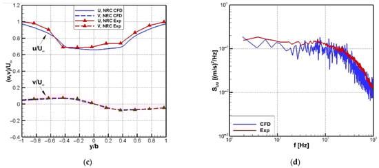 To validate the CFD results, OpenFOAM (2014) [] was applied to SFS2 flow simulations. SFS2 is an updated version of the simple frigate shape (SFS) with a more elongated superstructure and pointed bow compared to the original SFS. The SFS is a conceptual standard ship design originally proposed by a ship airwake modelling working group within The Technical Co-operation Program (TTCP) to provide an easily repeatable benchmark case for validating CFD codes for ship airwake applications (Wilkinson et al. []). At full scale, the SFS2 is 455 feet long (138.68 m) and 45 feet (13.72 m) wide; details of the geometry are described by Zan []. Detailed numerical simulation and validation against wind-tunnel data, including mean velocities, turbulence intensities, and power spectral density, were reported by Yuan et al. []. Selected results from Yuan et al. [] are replicated in Figure 1.