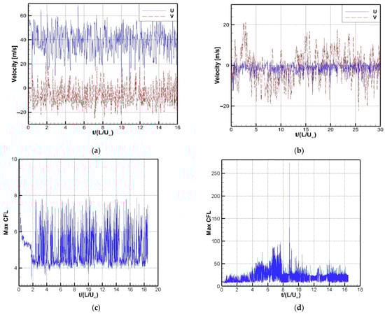 Time histories of velocity. (a) SFS2, longitudinal and lateral velocity components u and v at a middle location over flight deck at a headwind condition. (b) SFS2, longitudinal and lateral velocity components u and v near intersection of the flight deck and hangar aft face. (c) CPF, max. CFL number at Green 30°. (d) Canadian ship A, max. CFL at Green 30°.