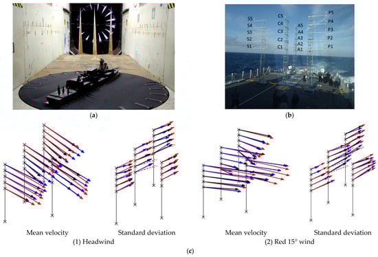 Combined experimental and computational investigation of the CPF in motion. (a) Setup of the oscillating CPF model in the wind tunnel. (b) Corresponding anemometer support masts on flight deck at sea trial. (c) Mean velocity vector and standard deviation in the CPF flight deck wake for roll conditions; red—wind tunnel, blue—CFD, black—sea trial.