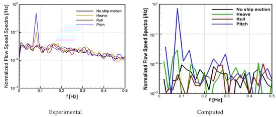 Effect of ship motion on airwakes—spectra of a probe in the airwake middle at the height of the rotor plane in helicopter high hover, adopted from Yuan et al. [].