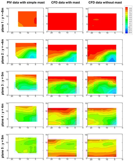 Figure 8 compares the flowfield with a headwind for the selected portside planes in the ship airwake, which cross-checks the data within the extracted box. When compared with PIV results, the computed results capture the major features of the flow. For the headwind case, a reduction in longitudinal velocity can be seen near the centre, within the wake behind the hangar. Significant gradients exist in the time-averaged values of the velocity components, which would affect the trim of the helicopter. The CFD-predicted separation zone was slightly smaller than what is shown in the PIV results. The results from CFD configurations both with and without the masts are reasonably comparable. The flow field for Red 20° wind was reported in Yuan et al. []. This test case was much more challenging because the oblique wind intensifies the complexity of the separated flow. Nevertheless, the CFD results match the PIV results well in general. The velocity deficit and gradients were reasonably predicted. The prediction of the separation zone using the no-mast configuration was even better than that observed for the with-masts case. This was mainly attributed to the applied numerical scheme.