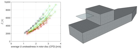 Using recent CFD results, this relationship was investigated by comparing unsteady rotor loads and the average turbulence as calculated from the CFD results in a rectangular volume approximately encompassing the rotor disc area. Figure 9 shows the relationship for a number of different wind directions (left plot) and helicopter positions (right plot). The figure shows the vertical unsteady force versus the unsteady flow quantity in groups corresponding to different wind speeds (each line) for different rotor positions (line type) and wind directions (line colour). This relationship was used to build a small-sized database when compared with the CFD data of the extraction box for the use of flight simulators.