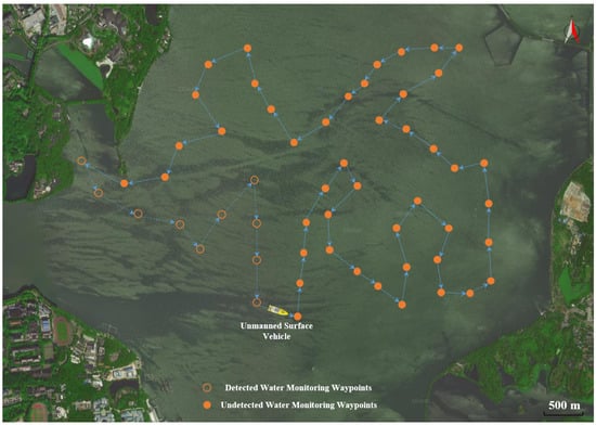Unmanned surface vehicles (USVs), which have attractive operating and maintenance costs, the capability to perform at high intensity, and good maneuverability [], have gained wide attention in scientific research recently. For monitoring pollutant concentrations in lakes or oceans, USVs can be equipped with multiple monitoring sensors to effectively collect environmental data, as well as avoid direct long-term human exposure to hazardous environments [,] (as shown in Figure 1). In particular, prior environmental information and sampling path planning are important components for the guidance systems since they facilitate the design of an optimal path based on navigation information and mission objectives []. In this context, effective path planning for USVs is crucial for saving operation time and mission costs. Consequently, it has become a research hot spot to design a fast convergence algorithm that facilitates optimal path planning [].