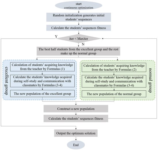 where is the knowledge acquired by student i at time t, and is the knowledge acquired by student j from the teacher at time t, j is not equal to i. Following the completion of the learning process at time t, two groups are combined and regrouped by their acquisition level until the termination condition is met, is the normal distribution [] and represents the knowledge of student i at time . The process of the GTOA can be seen from Figure 2 and the pseudo-code of the GTOA is implemented in Algorithm 1.