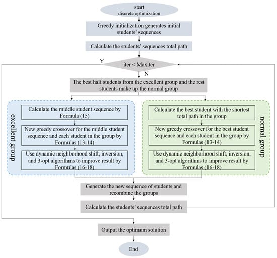 In discrete optimal problems, the DGTOA is modified in two stages. For the first stage, the greedy principle [] is used to generate the initial students’ sequences. For the later stage, students are divided into two groups, with the top 50 percent of students on the total path assigned to the excellent group and the rest to the normal group. The following process is shown in Figure 3.