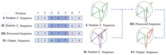 where is the distance between cities and , the subscript denotes the student number, ranging from 1 to M, in which M is the total number of students. The superscript denotes the student’s corresponding sequence position number, ranging from 1 to N, in which N is the total number of cities. In addition, is the unvisited city position and is the current sequence length of student . For instance, positions 3 and 5 are randomly selected from the students and (as seen from Figure 4). Then the smaller distance (positions 3->7->1) is selected and the repeated city 1 is removed. Finally, the unvisited city 6 is added to the output sequence in a greedy rule.