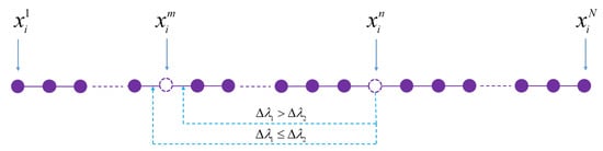 To begin with, two positions m and n are randomly selected from the students and , and the distance between two positions is calculated using Formula (14). Then the sequence is selected between positions m and n from the students and with a smaller length replacement to between positions m and n. Additionally, the repeated city is removed between positions m and n. Finally, the rest of the cities will be inserted into a new sequence according to the greedy rule, as follows: