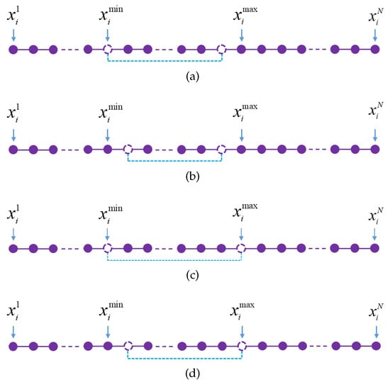 For instance, if , reverse the order of ; if , reverse the order of ; if , reverse the order of ; if , reverse the order of . As depicted in Figure 7a–d.