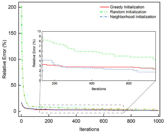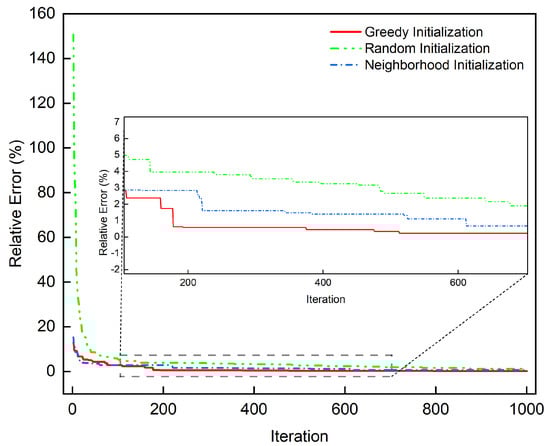 According to Figure 8, the neighborhood initialization and greedy initialization show a considerable advantage in the initial solution over random initialization. For random initialization, it takes 500 generations to reach an RE of less than 3%, but for neighborhood initialization and greedy initialization, they take only 100 generations to satisfy convergence. Compared to neighborhood initialization, greedy initialization can achieve an RE of less than 1% within 200 generations, whereas neighborhood initialization takes 600 generations to achieve an RE of less than 1%.