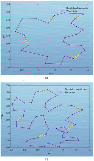 Simulated USV path tracking results at 25 and 50 waypoints. (a) Simulated USV path tracking results at 25 waypoints. (b) Simulated USV path tracking results at 50 waypoints.