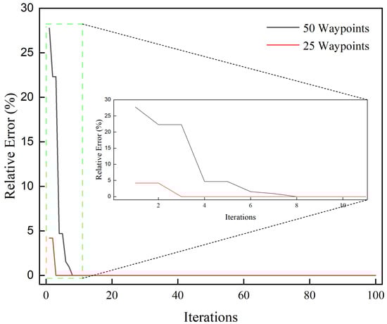 To evaluate the effectiveness of the designed DGTOA in the context of USV path planning, the USV model published in [] is used to verify the algorithm’s performance in MATLAB. The control algorithm is derived from the line-of-sight guidance laws described in [,]. For planning the path, 25 and 50 target waypoints are randomly generated, and then the relevant waypoints are entered into DGTOA. Finally, the optimized paths are provided to the simulated USV for tracking control experiments. The results are shown in Figure 11a,b, where the blue stars represent the waypoints and the solid red line indicates the USV tracking trajectory with the speed of 1 m/s. The generated paths are of satisfactory lengths, and no paths cross, significantly reducing the time and energy required for USV. Furthermore, the convergence RE plots of the 25 and 50 target waypoints are shown in Figure 12. When 25 target waypoints are considered, the DGTOA converges to the optimum after only three iterations. Meanwhile, for 50 target waypoints, the DGTOA converges to the optimum in only eight generations. From the two waypoint cases, the DGTOA converges to the optimal solution in 0.47 s and 0.58 s, respectively. In general, the DGTOA has good performance in terms of optimal solution and convergence speed.